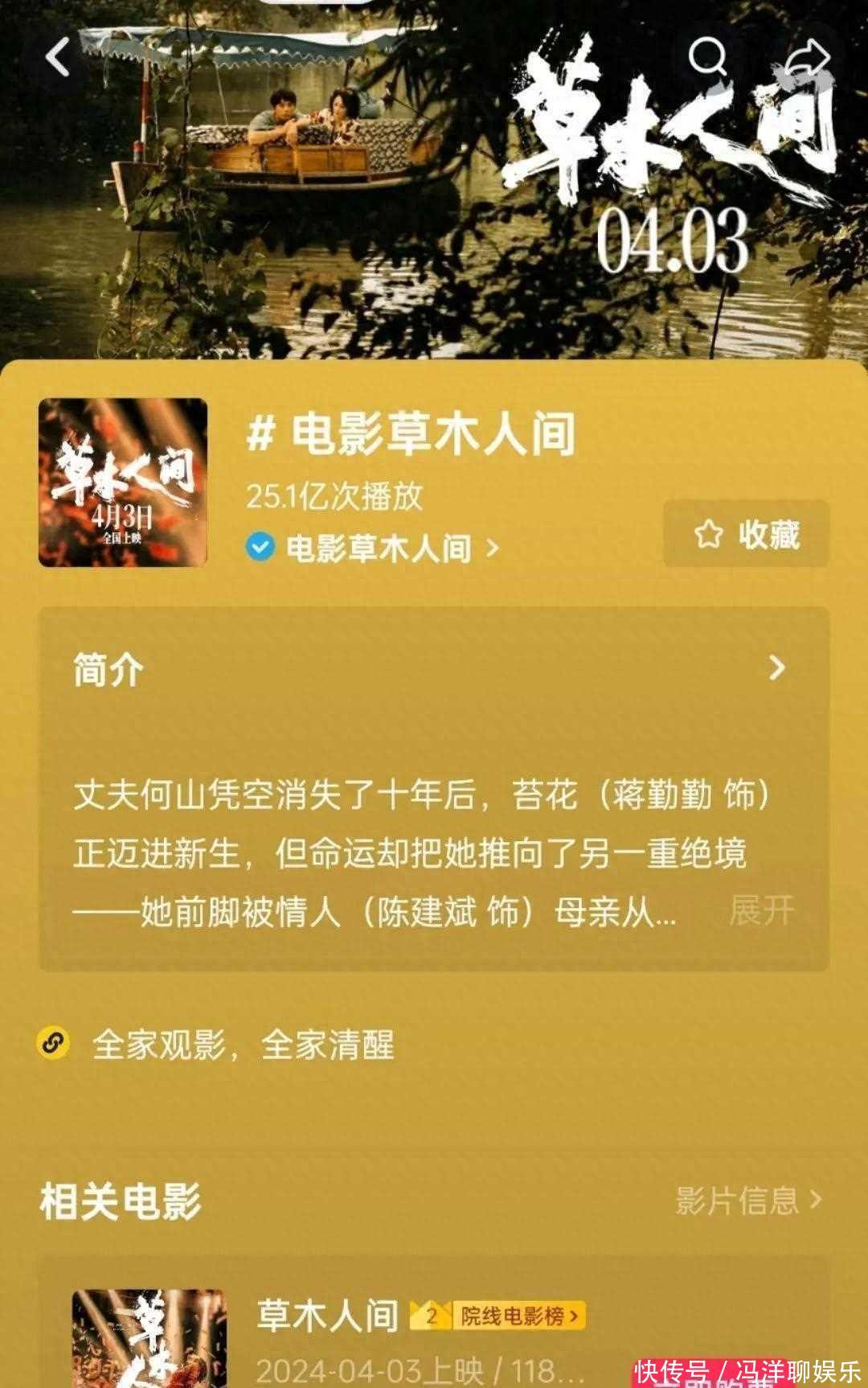 阐发抖音话题数据披露,《草木东说念主间》的播放量高达25.1亿,热度榜近亿,单条视频点赞量更是冲破了150万,这些数据无疑证明了该片的一定著明度。