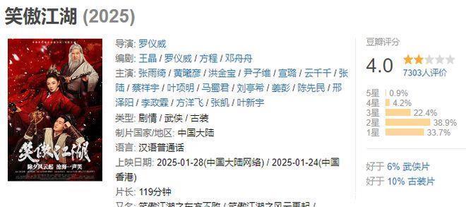 在豆瓣平台,《笑傲江湖》被打出了4.0分,二星差评占比最高,约为38.9%,其次是一星差评,占比约为33.7%。