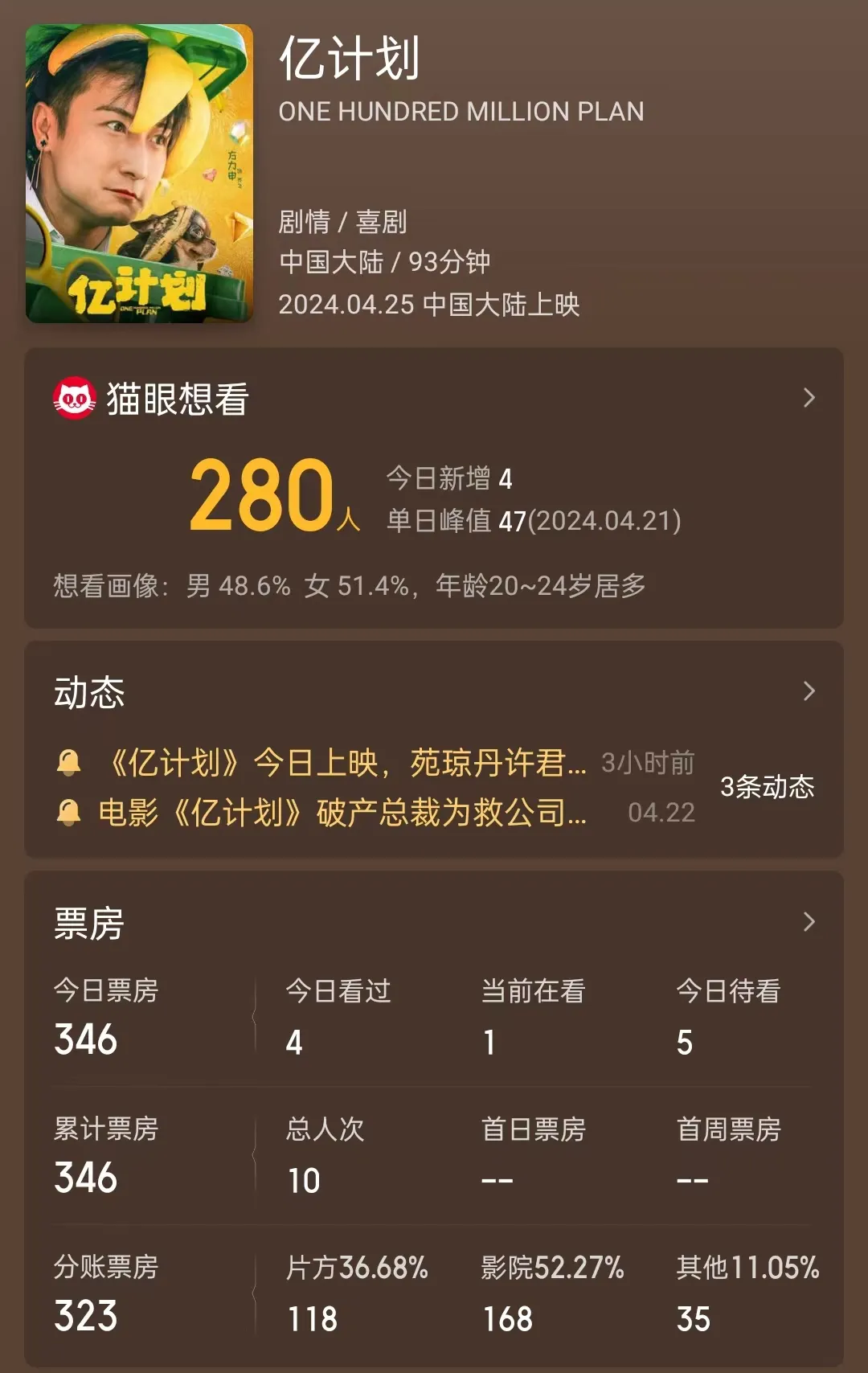 据数据统计,当日只是只消9东谈主买票,首日票房只是只消346元。