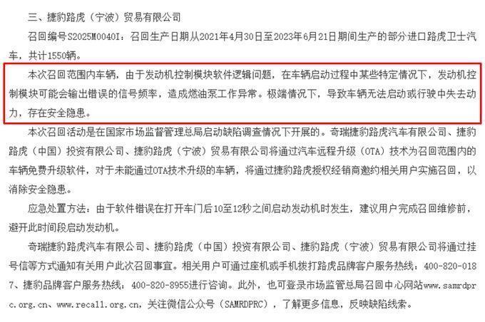 波及的车型分娩时辰从2011年2月4日-2024年2月25日星空app,包括路虎国产揽胜极光、发现通顺版;入口揽胜、揽胜通顺版、揽胜星脉、发现、卫士、发现神行、神行者2。捷豹国产XEL、XFL、E-PACE;入口F-PACE、F-TYPE、XE、XF、XJ。