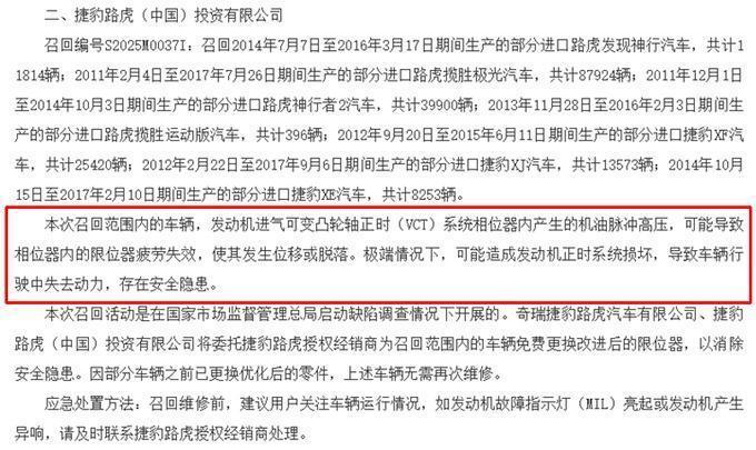 这次调回主若是发动机问题,包括发动机进气可变凸轮轴正时(VCT)系统相位器内产生的机油脉冲高压、发动机为止模块软件逻辑,极点情况下,可能导致车辆无法运行或行驶中失去能源,存在安全隐患。