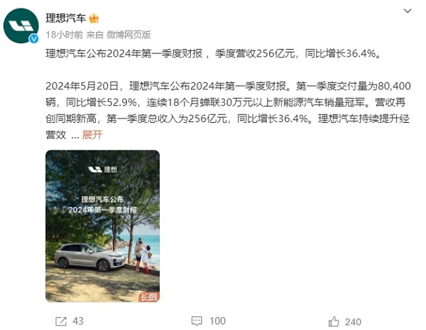 中国经济网5月21日讯(记者 姜智文)想象汽车昨日发布财报线路,公司2024年一季度营收256亿元,同比增长36.4%;经诊疗净利润为13亿元(扣除股权激勉用度),邻接六个季度盈利;毛利率为20.6%,保合手健康慎重。