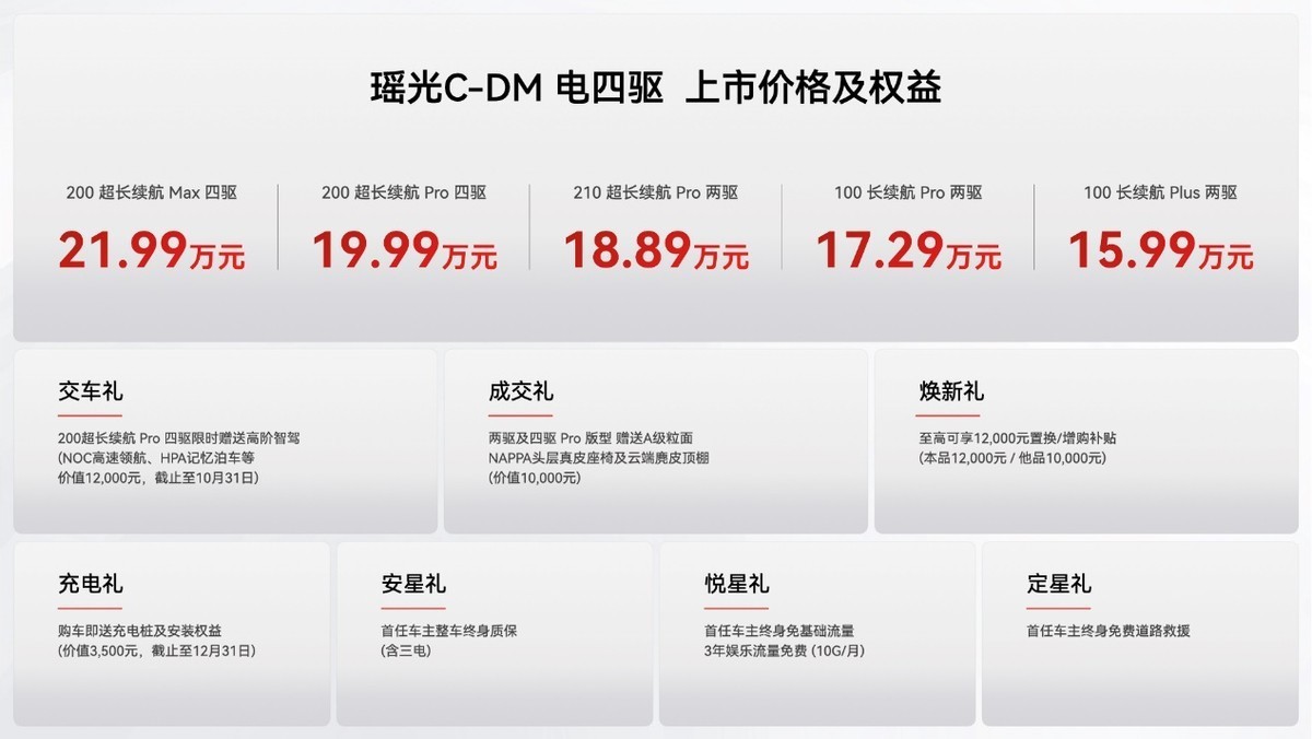 新车共推出超长续航Pro四驱、超长续航Max四驱两款成立版型,官方率领价为19.99-21.99万元,以全新的新能源造型、首搭雪豹四驱系统、升级飞鱼底盘2.0、配备L2.9级高阶智驾,引颈新能源期间的时期变革,吹响高端混动车型价值升维战。此外,瑶光C-DM两驱版块官方率领价区间为15.99-18.89万元。