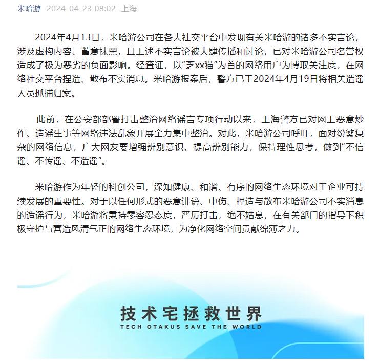 米哈游微信公众号发布声明称,经查证,以“芝xx猫”为首的相聚用户为博取柔柔度,在各大应答平台持造、散播伪善音问,警方已于2024年4月19日将相关训斥东说念主员抓捕归案。