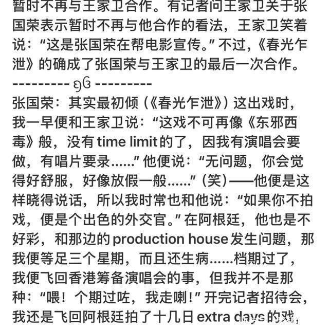 这不禁让东谈主回思起这些年来,王家卫与多位顶级演员的调和均已中断。最出名的是张国荣,在拍摄后《春光乍泄》后晓谕不再调和,在我方的97年演唱会上坦言身心俱疲;一样,张曼玉因《2046》戏份被删,一样合计过于奢靡演员;张校友因一个昂首动作重拍60次,心里留住暗影;梁家辉不仅替张国荣发过声,说《春光乍泄》是附近他的热度,更直言享受不了《东邪西毒》。