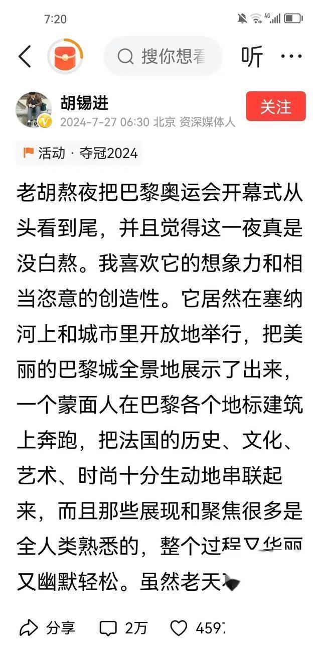 可即便如斯,开幕式仍有东谈主在背后点赞,合计其“冲破传统”、“有创意”。 一些大V和公知也在外交媒体上抒发了对开幕式的嘉赞之词。