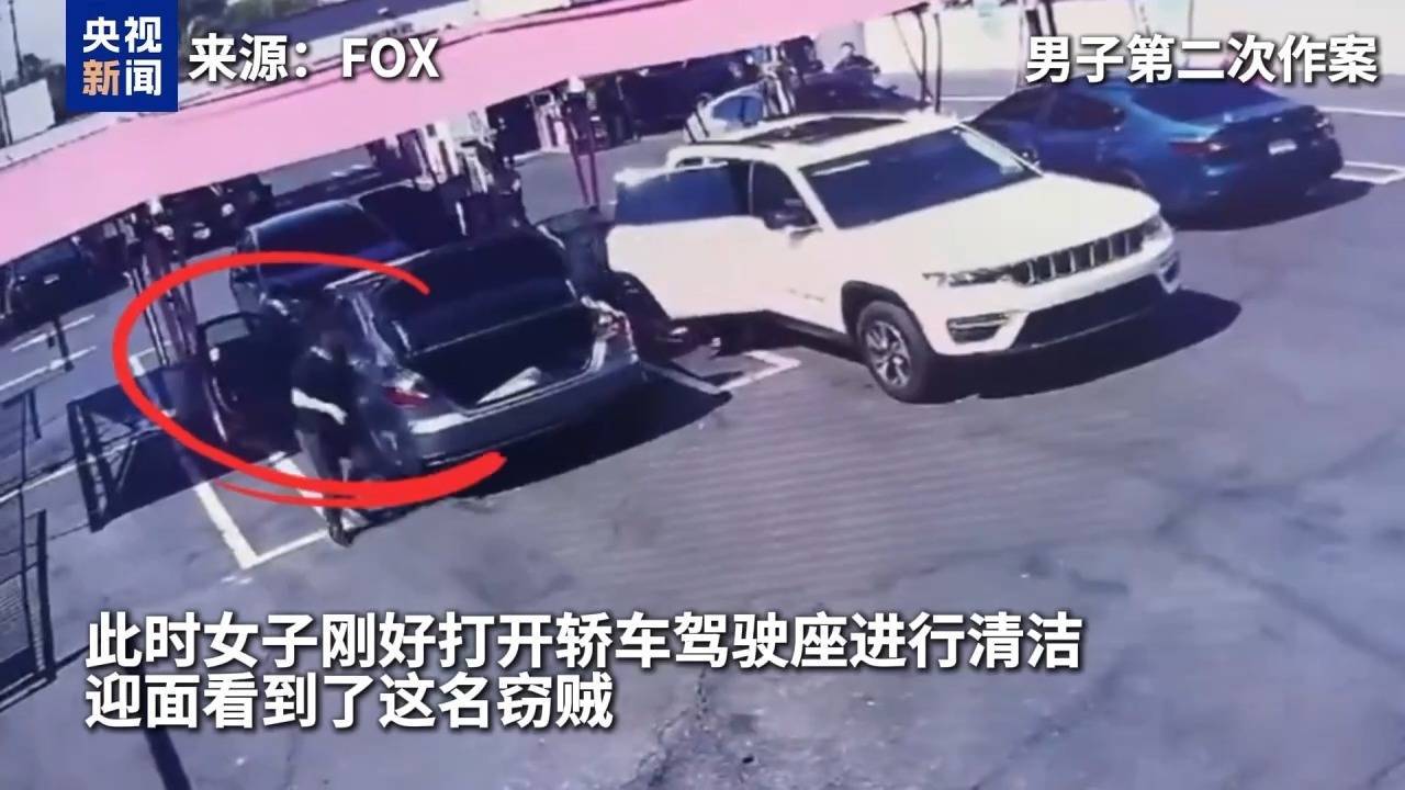 r视频中不错看到,女子并未戒备到有东谈主行窃,仍在清洁车辆。随后不久,窃贼再次从白车后座出来并又一次开启这名女子的轿车副驾车门。此时,女子刚好翻开轿车驾驶座车门进行清洁,当面看到了这名窃贼。