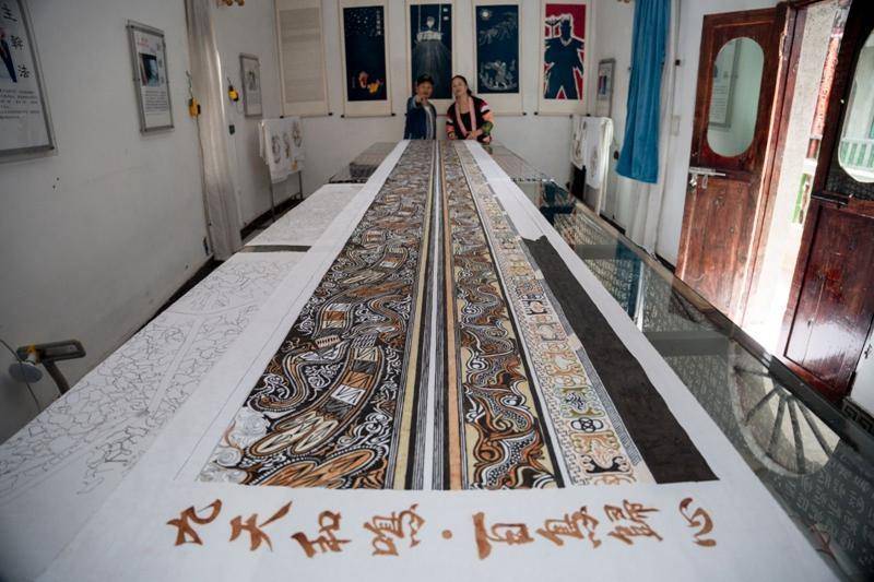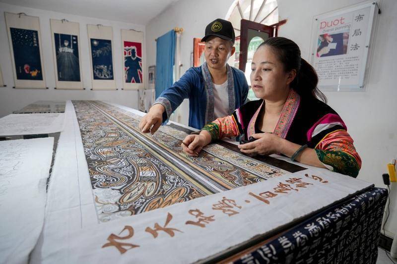 10月17日,贵州省毕节市织金县上坪寨乡八寨村,吃力了一整天家务的苗家绣娘杨丽莙,摊开了长长的布条,用轻浅的蜡刀不竭昨天的工程。今天,耗时近10个月的作品——《九天和鸣·百鸟归心》自然彩色蜡画壁挂圆满完工。