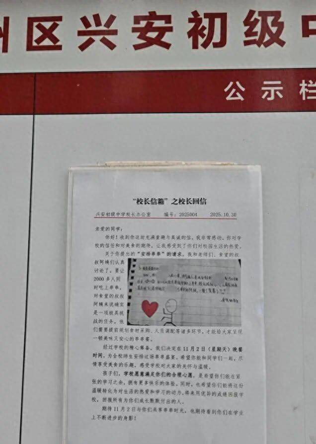 兴安中学校长办公室回复该学生,校长同学校敦朴、食堂使命主谈主员盘问,要让学校2000多东谈主一同吃上串串是一项极具挑战性的任务,需要提前缱绻食材采购、东谈主员调配等,历程学校悉心磋议,决定于11月2日晚餐,为全校师生安排串串盛宴。“孩子们,学校应承得意你们的合理心愿,但愿你们能在垂死学习之余,领有更多振作体验。”