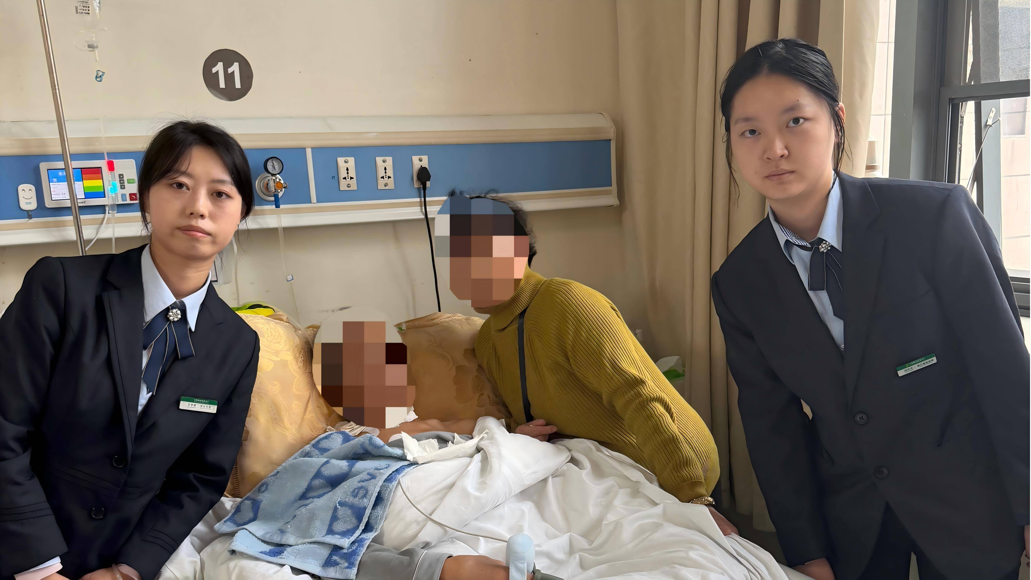 在病院病房内,职责主说念主员注重翼翼地核实客户情状与业务需求,全程保持耐性抽象的派头,一边轻声安抚焦躁的家属,一边高效完成各项核实进程。