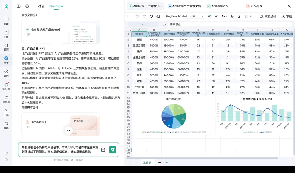 Agent中比较有代表性的是Office Agent,也许是“全网第一个信得过吃透了Office功能的AI”,只需要用当然言语对话,以前需要大批通过鼠标拖拽和函数调用技艺完成的操作,就不错高效完成。况兼借由目田画布的买通,GenFlow3.0也支撑用户进行互助,包括东说念主和东说念主之间、东说念主和AI的、AI和AI之间的互助。