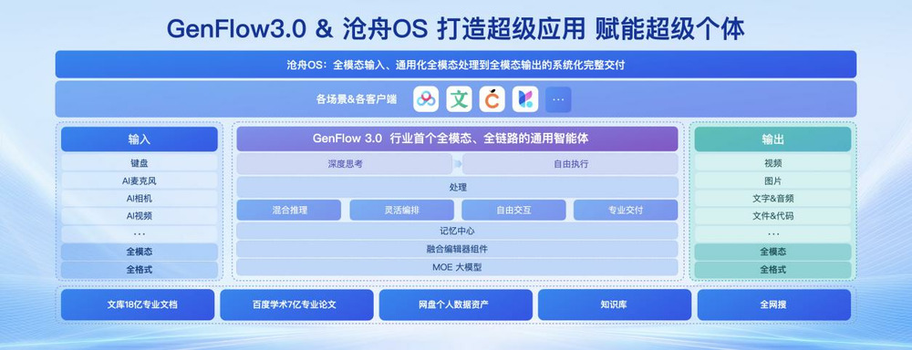 当前,百度网盘、百度文库等App之间的数据,包括公域数据和个东说念主授权数据,仍是皆备买通;沧舟OS支撑全模态输入、通用全模态搞定到全模态输出的系统化委派;东说念主机交互方面,最新的GenFlow 3.0提供全模态全链路的通用智能体做事。比较之前刚完成重构时,两款期骗一方面作念的“更宽”,掩盖了涵盖工业、学习、文娱、办公的全场景;另一方面是作念得更深,每个场景都深度吃透。
