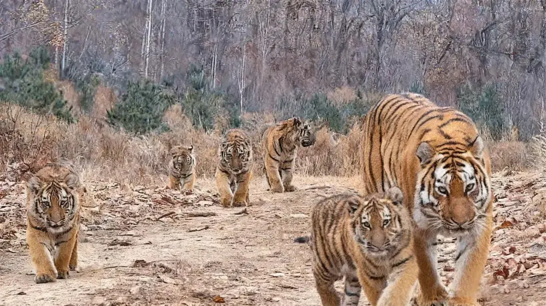 然则,万万莫得念念到,这五虎同框仅仅“前菜”,竟然还有六虎同框的,亦然在珲春保护地发现的,其来自宇宙天然基金会(瑞士)北京代表处(WWF)音尘指出,在11月,野生东北虎母虎带5只幼崽出当今东北豺狼国度公园珲春保护地,这是全球初次野生东北虎“六虎同框”的影像纪录。而这一次证据对个体身形、行走步态及体尺特征的分析判断,成年雌虎年事约9岁,五只幼崽约 6–8 个月大。