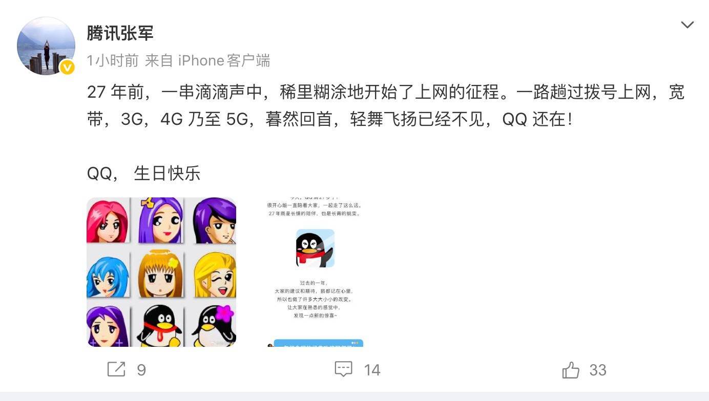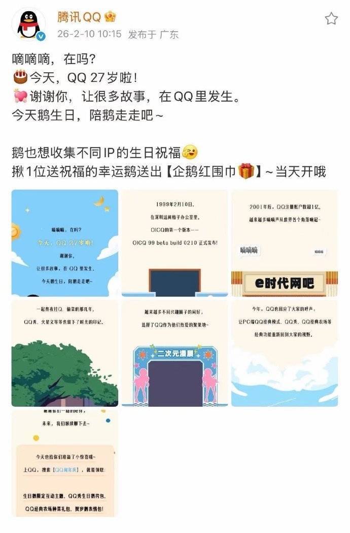 凤凰网科技讯 2月10日,腾讯QQ迎来其降生后的第27个岁首。腾讯公司公关总监张军也发文庆祝QQ上线27周年顾忌日,并祝愿QQ寿辰欢欣。张军示意,“27年前,一串滴滴声中,稀里模糊地运行了上网的征途。扫数趟过拨号上网,宽带,3G,4G乃至5G,暮然回首,轻舞热潮还是不见,QQ还在。”