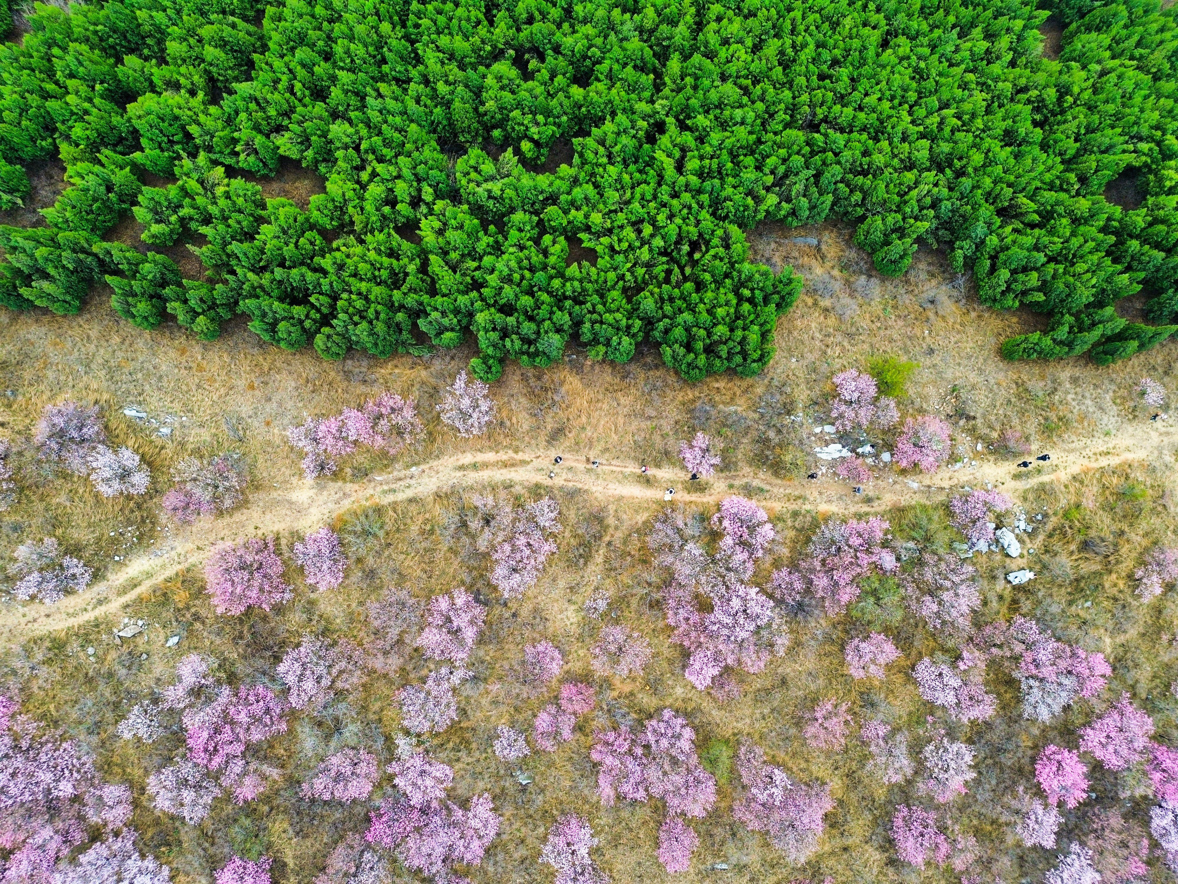时下星空app,山东省淄博市博山区石马镇上焦村桃花绽开,红粉色桃花撞色山峰另一侧的绿色松树,变成别样春日气象。