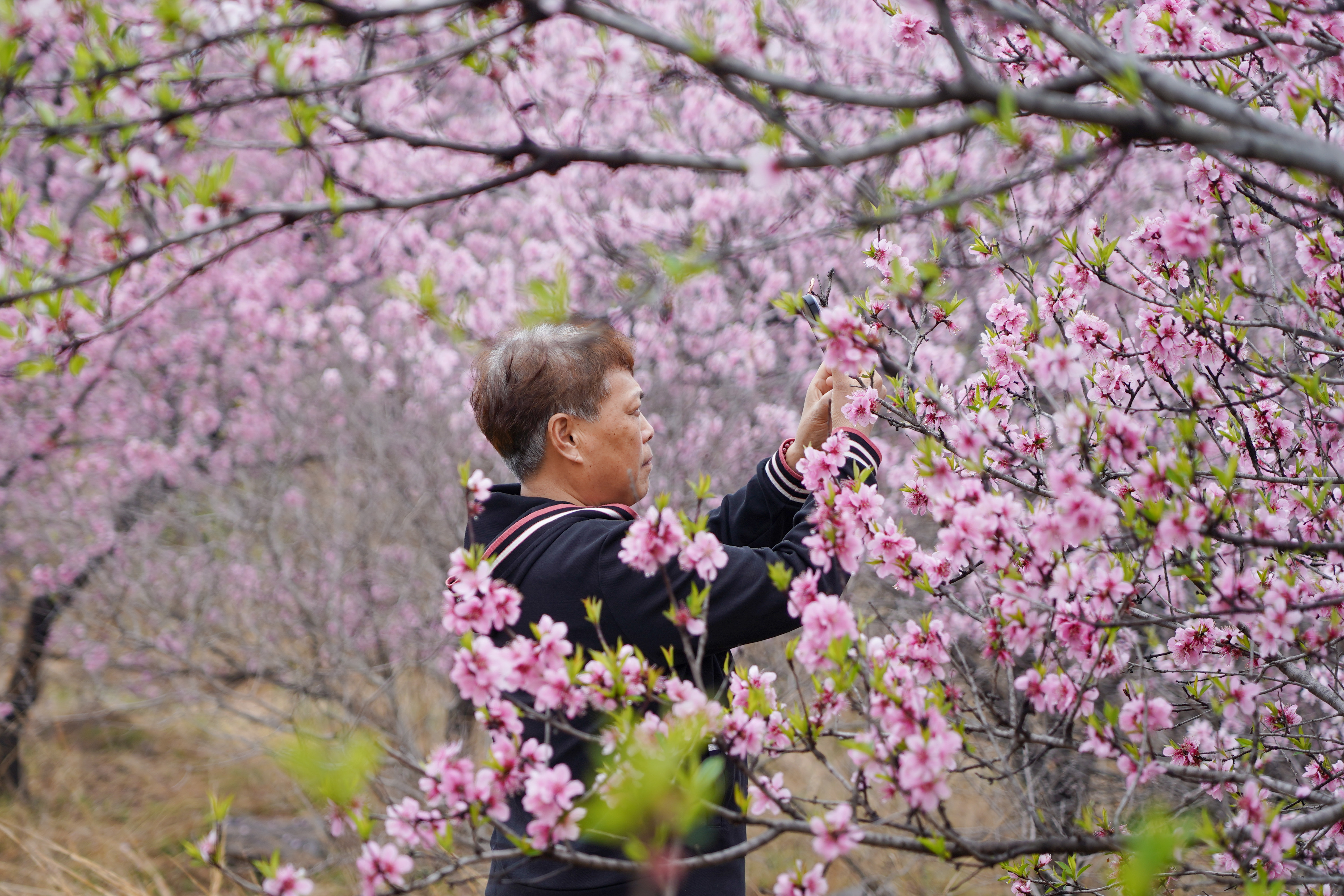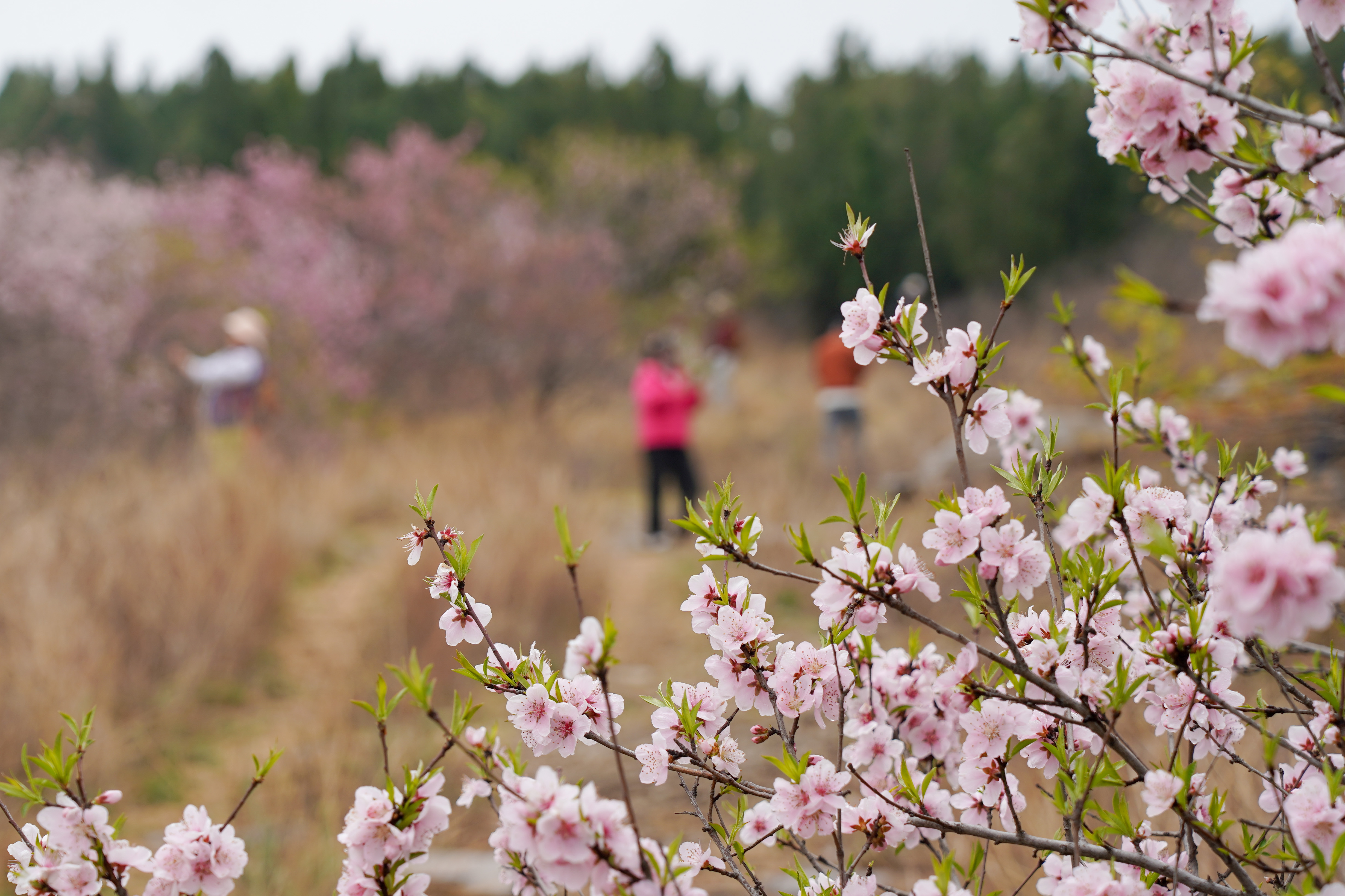 4月9日,游东谈主在山东省淄博市博山区石马镇上焦村桃林赏花游玩。新华社记者 朱峥 摄