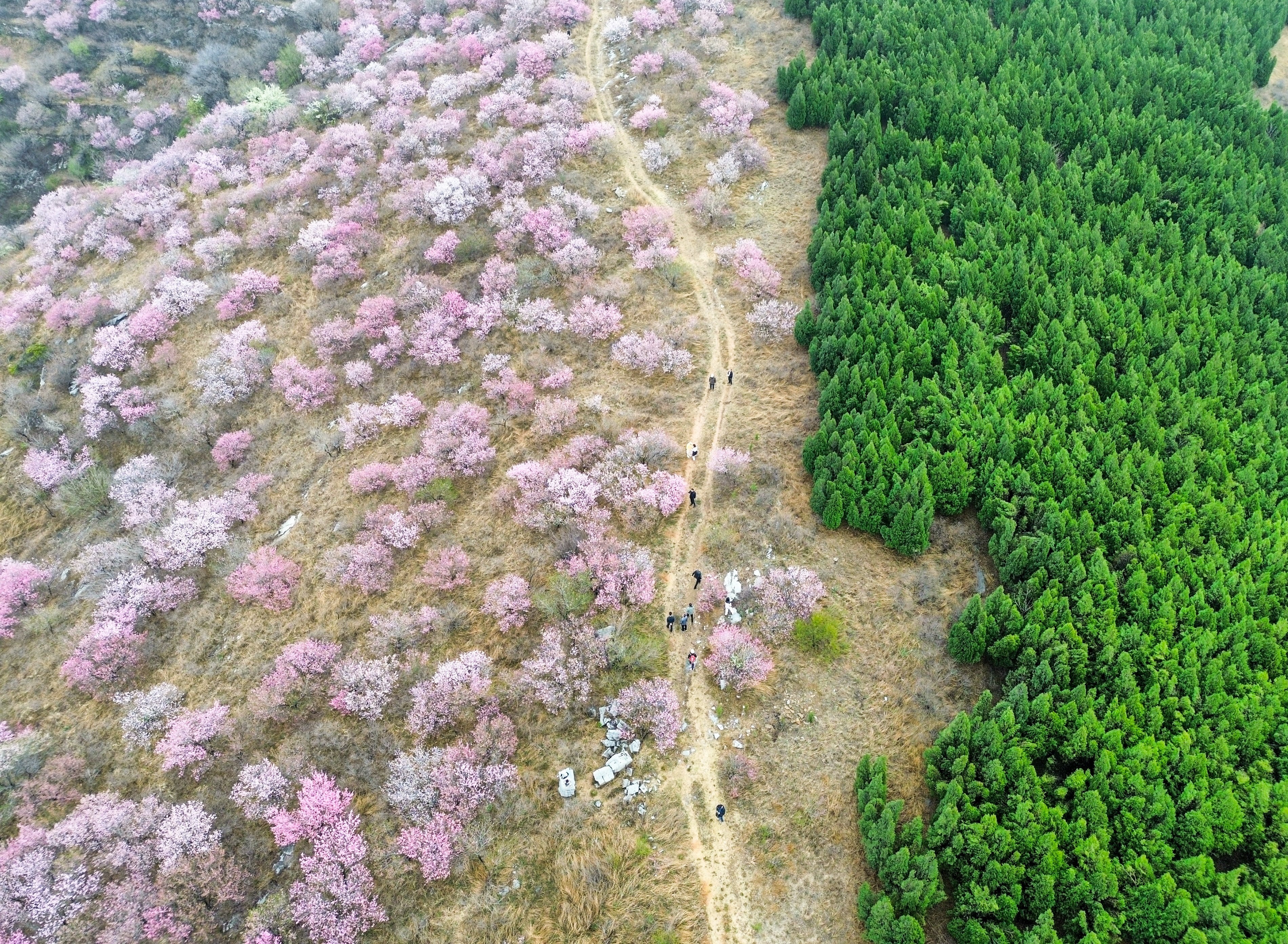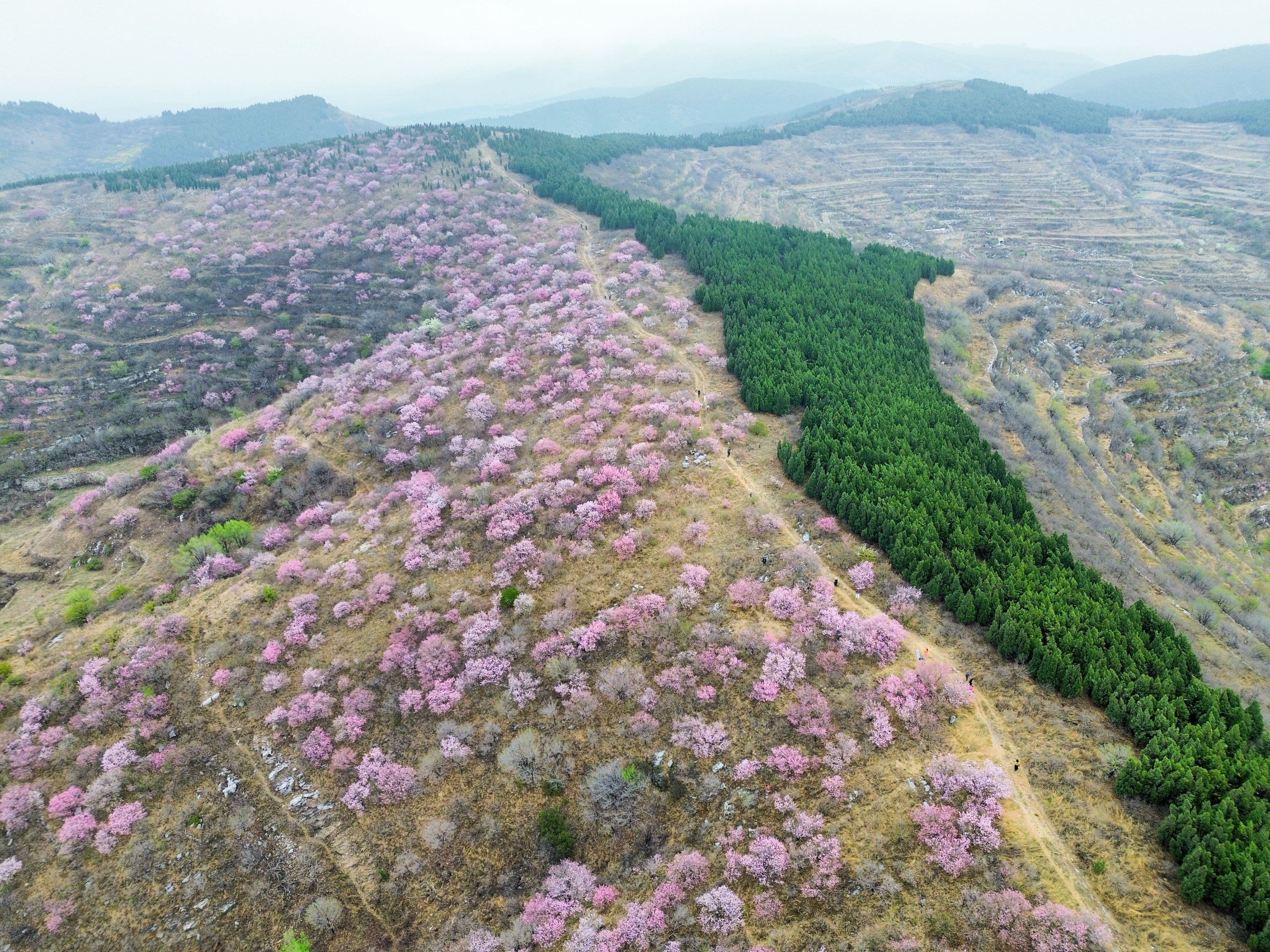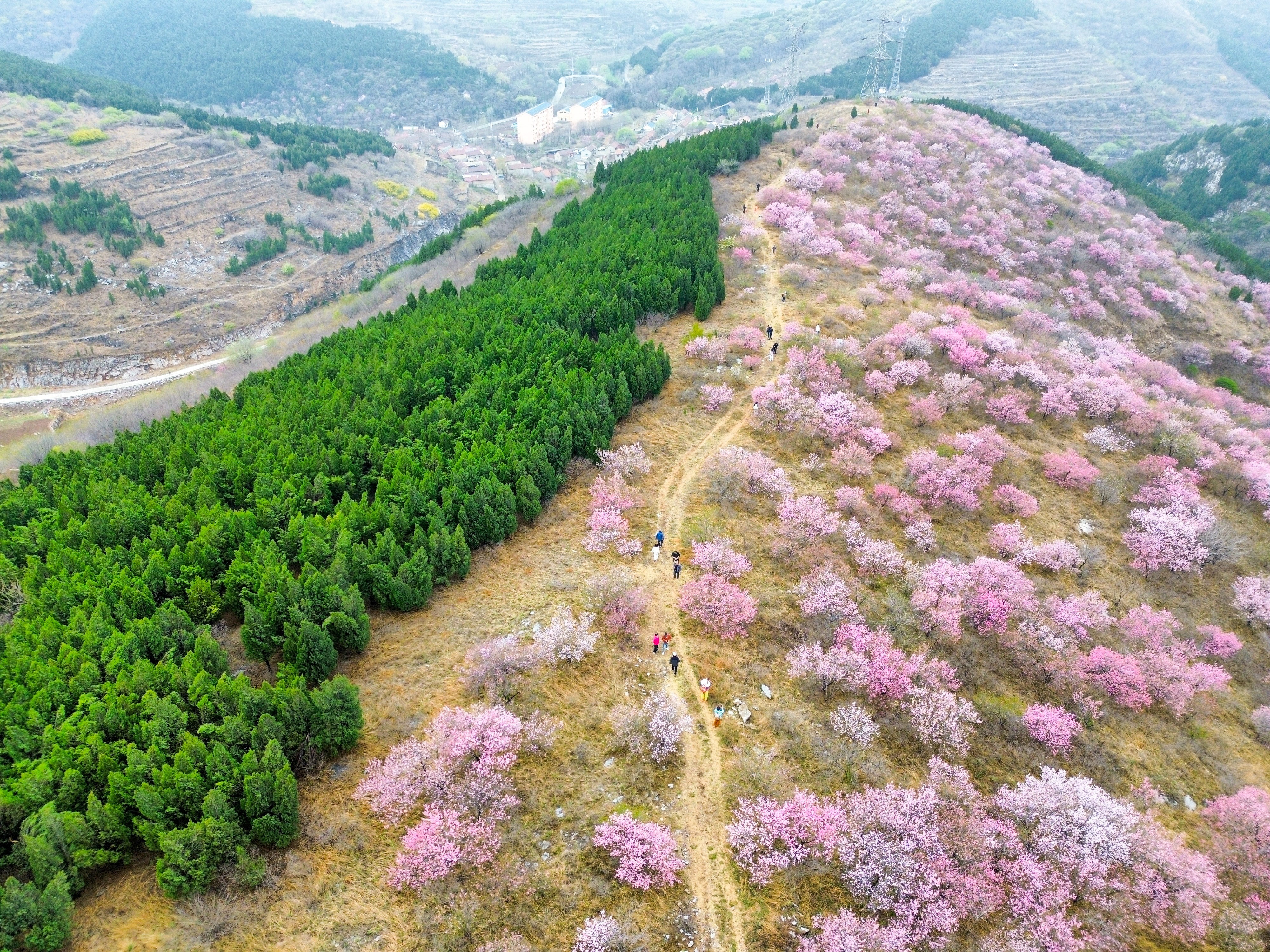 这是4月9日拍摄的山东省淄博市博山区石马镇上焦村桃林(无东谈主机相片)。新华社记者 朱峥 摄