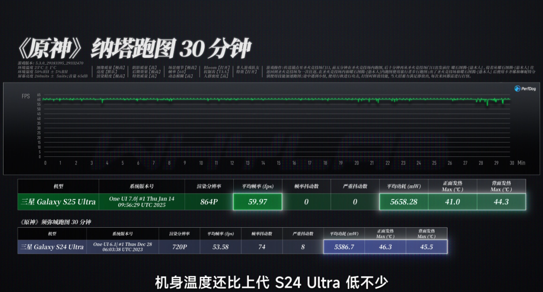 家喻户晓,最新的 iPhone 16 一些游戏方面的阅兵,不仅终于安排上了游戏方式,还强化了机身的散热能力,三星此次也跟进了,在更大的均热板以及新导热材料的加捏下。三星手机第一次战胜了最高画质的原神,在 864P 分辨率下取得了接近满帧的好成绩,在功耗接近的情况下机身温度还比上代 S24 Ultra 低不少,家喻户晓原神关于 8 至尊只可算是中等负载,在性能需求更高的游戏中,S25 Ultra 还能撑得住吗?