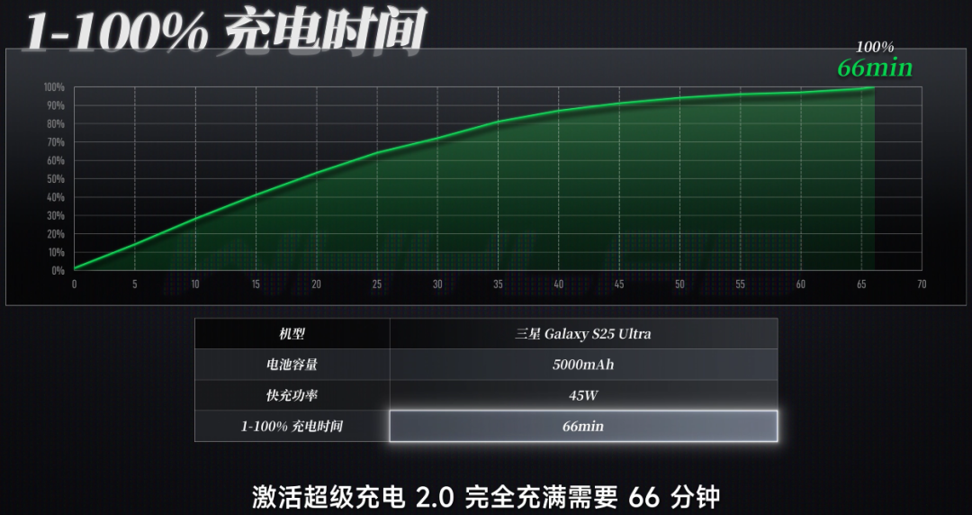 充电方面撑捏最高 45W,由于包装内并不附赠充电头,是以使用第三方头 + 5A E - Mark 线材进行充电,激活超等快充 2.0 十足充满需要 66 分钟,速率倒是可以接受。