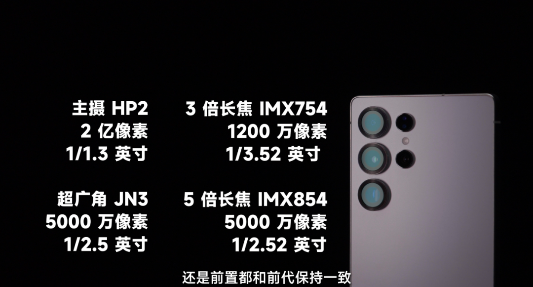 相机硬件上的升级并不显耀,唯独超广角更新到了的 5000W 像素 JN3,其它不管是主摄长焦如故前置都和前代保捏一致。