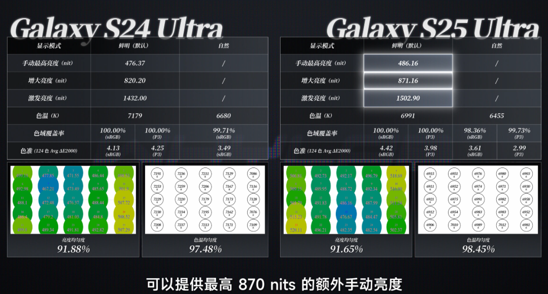 具体阐述还需参考我们的测试数据,手动最高亮度和全屏激励亮度分辨为 480nits 和 1500nits,此外 S25 Ultra 也提供了一个「阳光屏」方式,可以提供最高 870nits 的独特手动亮度。